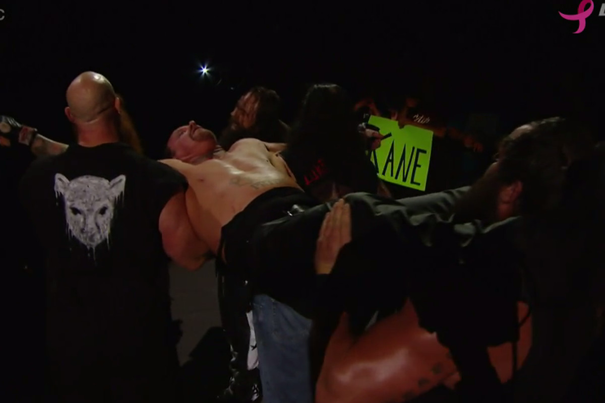 It saw the entire Wyatt family, including the new, intriguing, enormous member, Braun Strowman (holy fuck, Strowman has been around almost 4 years?!) beat the living shit out of Undertaker. Destroying him so mercillessly that it ended with the Wyatts carrying out Undertaker’s unconscious body in a kidnapping.