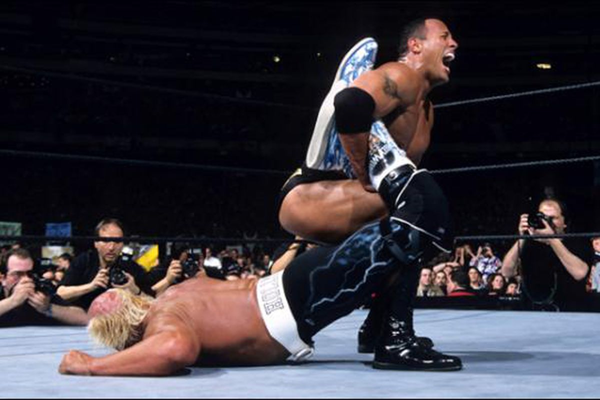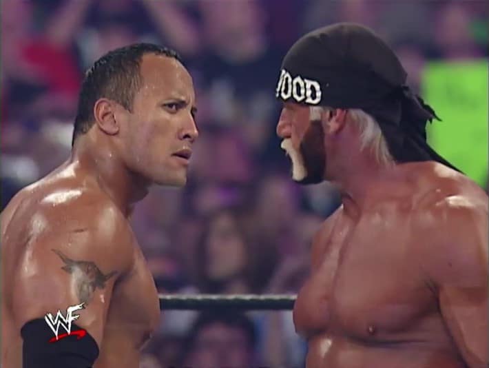 - The fucking amazing moment where both Rock and Hogan are face to face, yet both have to look to the sides and check out the unbelievable, rabid crowd.