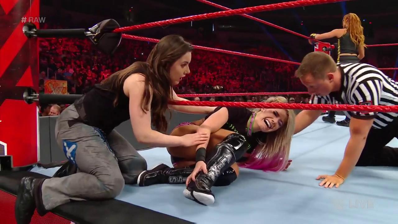 - Becky kicks a white haired 60 year old man in the knee to give Nattie an armbar.